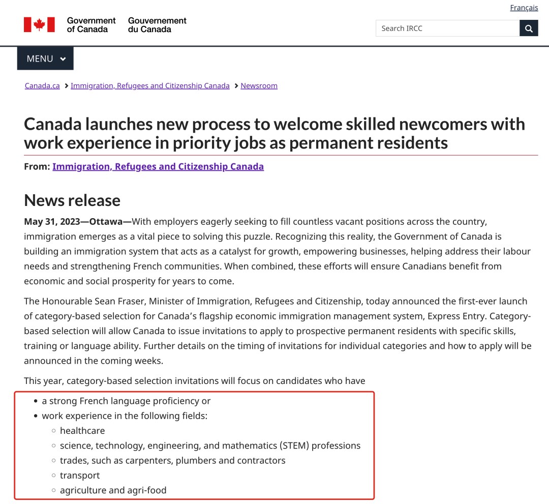 当地时间2023年5月31日,加拿大移民部长弗雷泽(Sean Fraser)公布,加拿大将首次在EE快速通道里推出基于类别的邀请系统。基于类别的邀请系统将使加拿大能够向具有特定技能、培训或语言能力的潜在永久居民发出申请邀请。下半年EE快速通道实施改革。