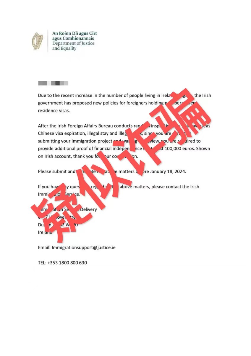 情况很突然,客户发我们了一个文件,疑似爱尔兰移民局发来的文件,我们就很疑惑,移民局没有发给我们律师,为什么会直接发给客户,问了才知道,是客户女儿收到让客户给女儿账户汇款的通知,我们一脸懵,赶快联系了爱尔兰的律师团队,问询此事。